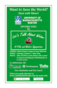 On October 2, 2010 an event was held on the campus of the University of Massachusetts, Boston. It was sponsored by the Department of Environmental, Earth and Ocean Sciences. This was our first multi-campus event with the participation of the Northeastern University and Tufts University. All three universities showed the film A Civil Action during the week leading up to the “Let’s Talk About Water” event. The film depicted a lawsuit on contaminated drinking water in Woburn, MA. The lead lawyer was Jan Schlichtmann, played by John Travolta in the movie.